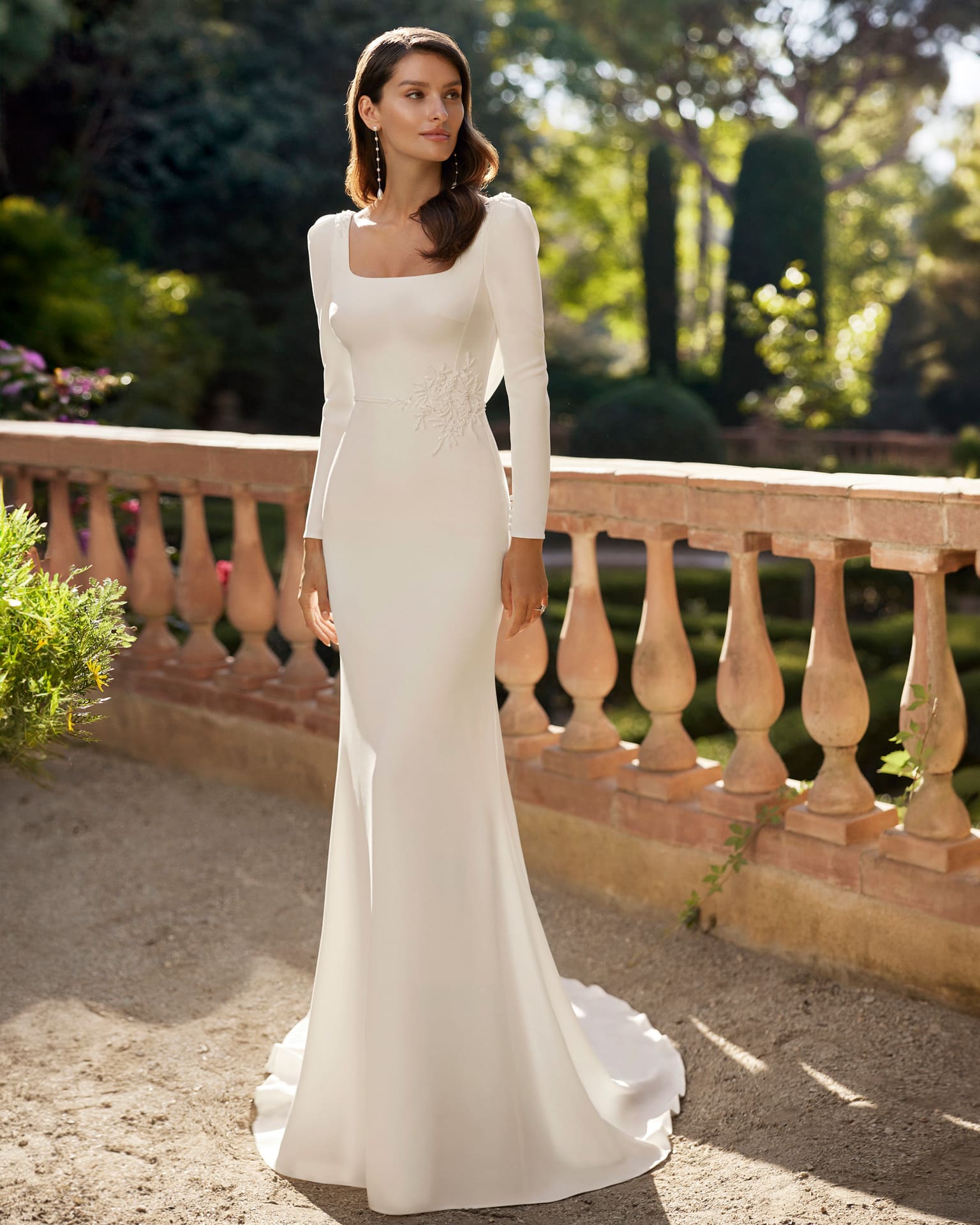 El vestido de novia DAISY de Adriana Alier es la elección perfecta para las novias que buscan un estilo romántico y sofisticado. Confeccionado en crepé con delicados detalles de pedrería, este diseño presenta un escote cuadrado que enmarca el rostro con elegancia, mangas largas que aportan distinción y una espalda escotada que añade un toque sensual. Su corte recto realza la figura con gracia, ideal para brillar en el gran día.