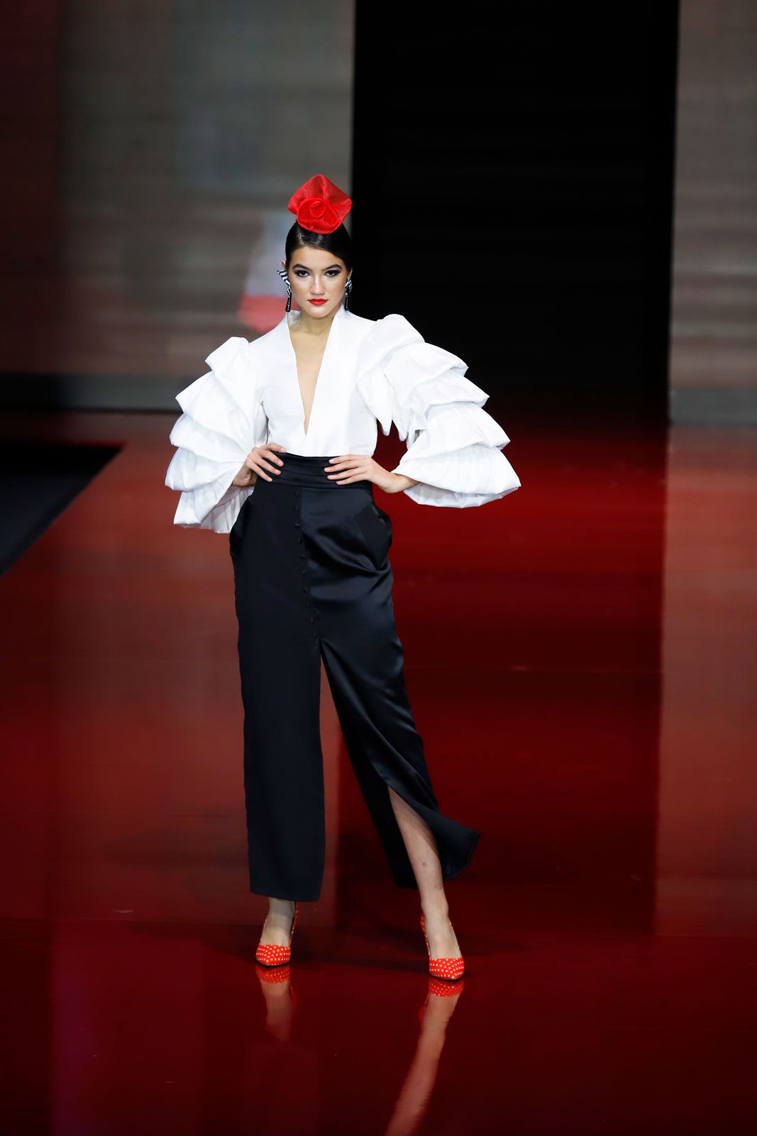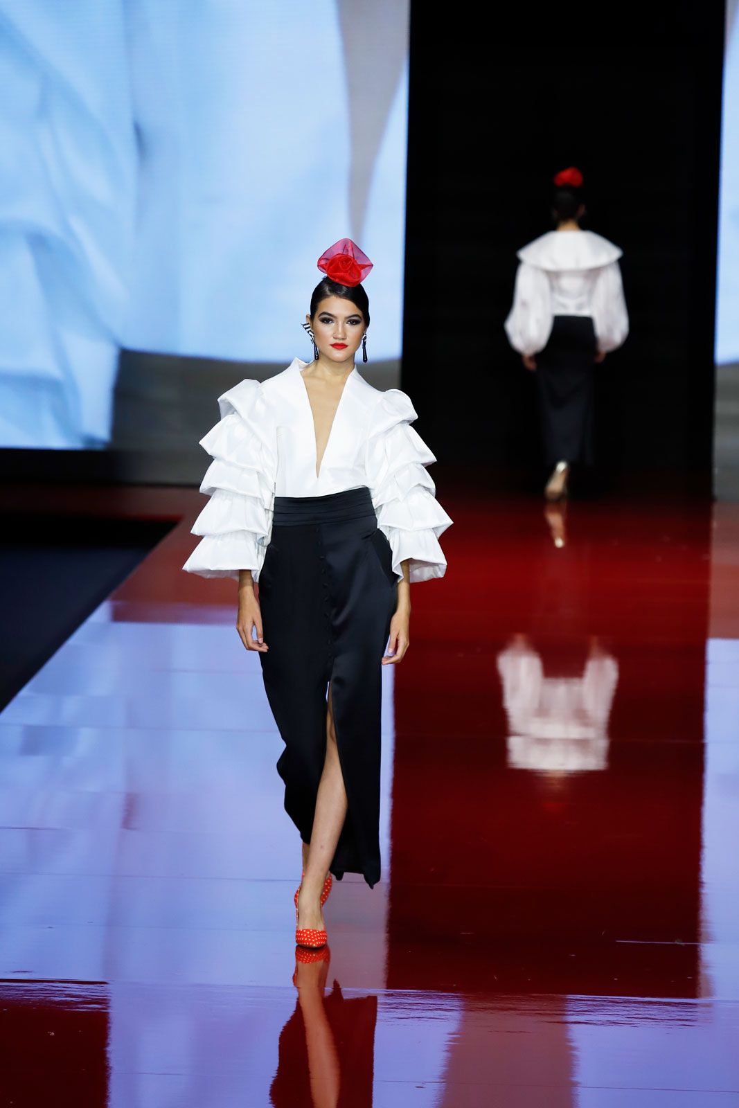 Camisa de seda con volantes en las mangas y escote con transparencia. Falda de tubo con abertura delante y detrás,
