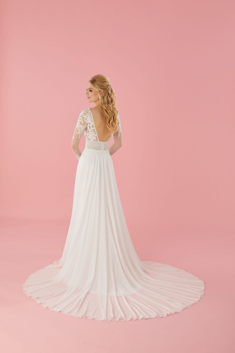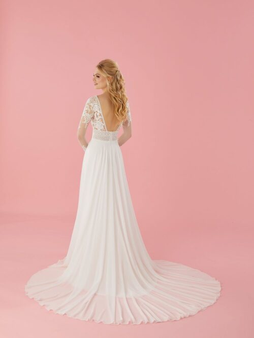 Vestido con cuerpo escarchado de bordado, cintura escalpada y escote en V, mangas largas y transparentes de tul Ivore con lentejuelas translucidas.