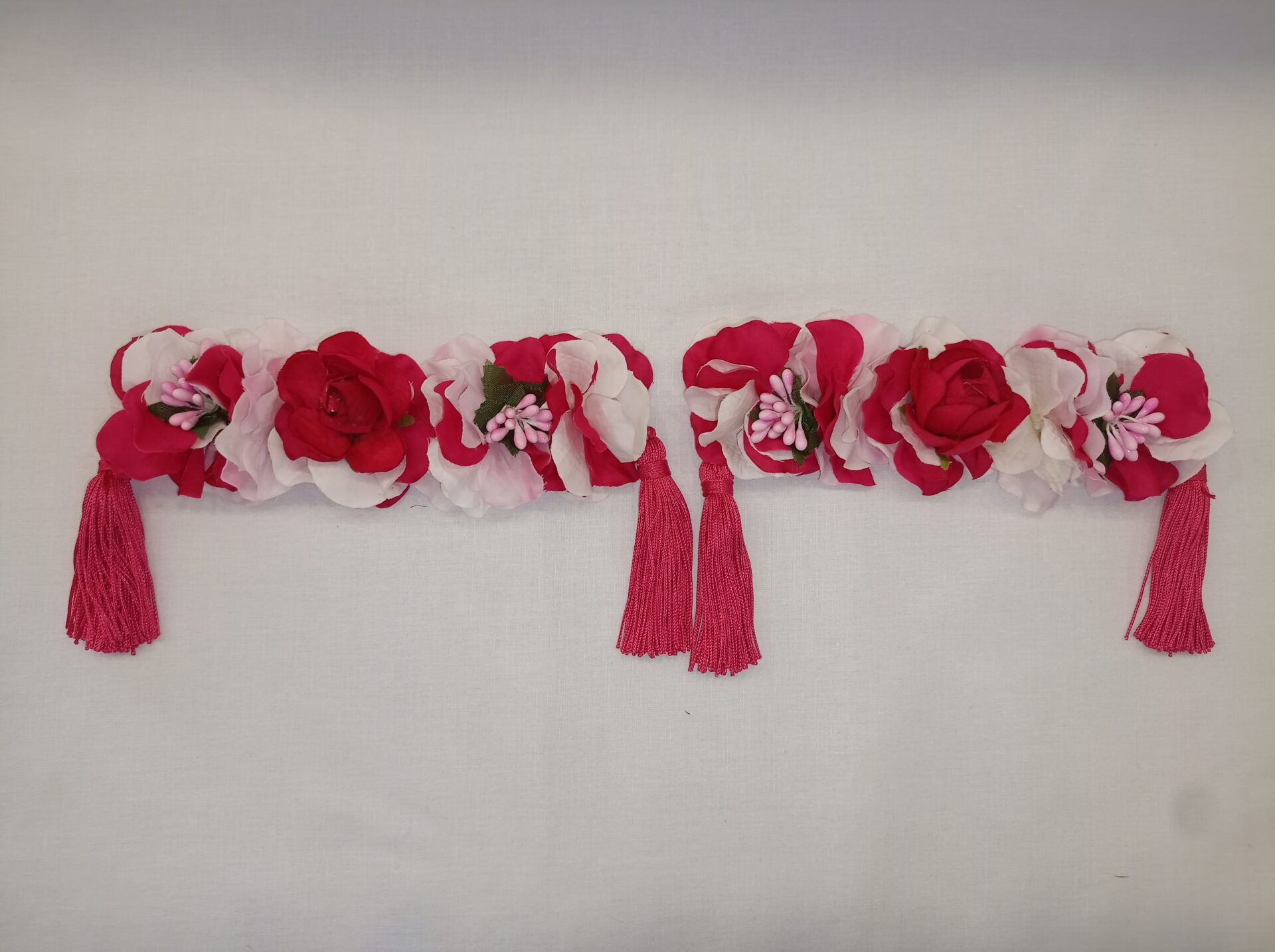 Hombrera de flamenca pequeña en tonos combinados rojos y blancos con una borla de flecos en cada extremo.