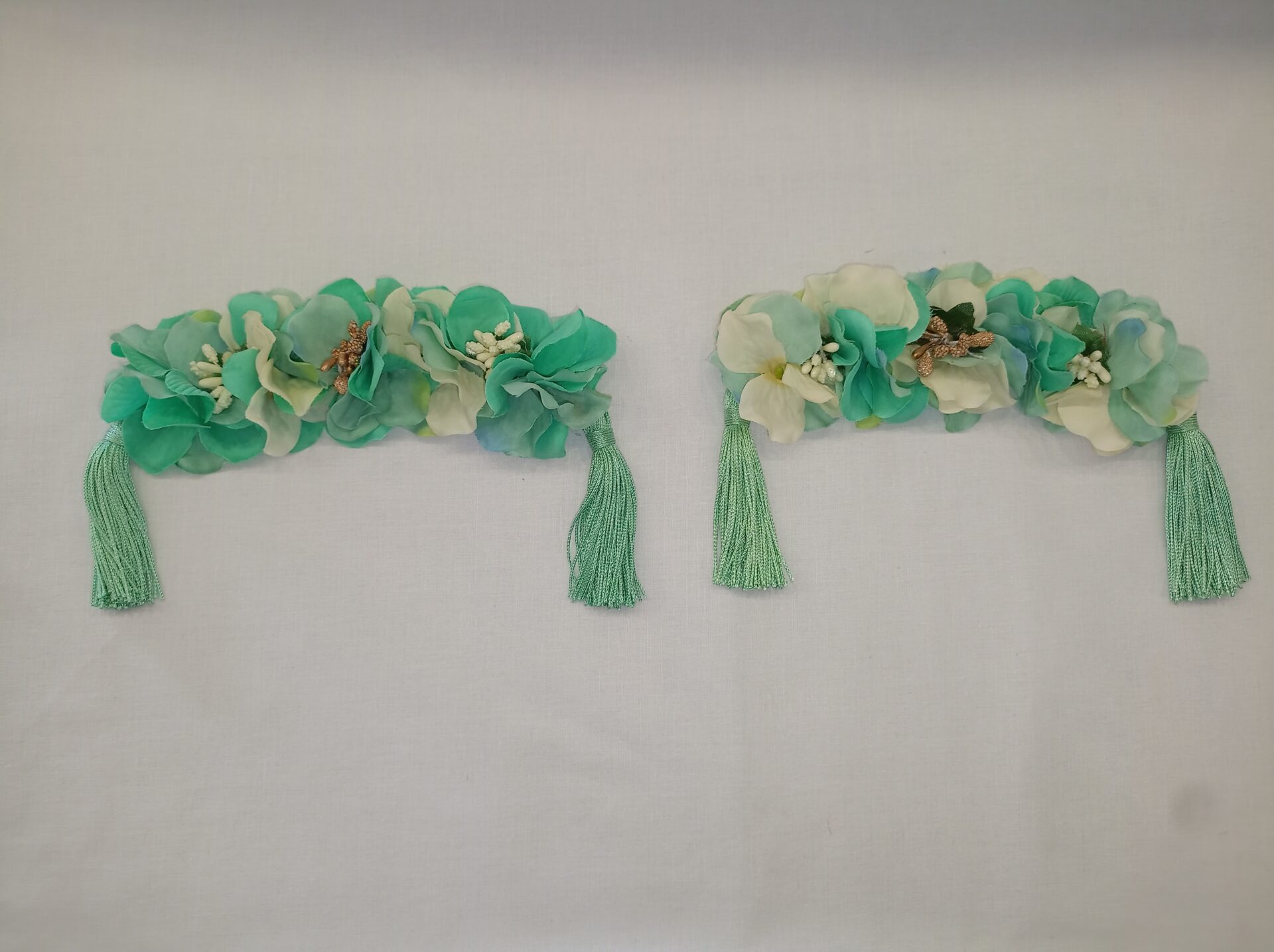 Hombrera de flamenca pequeña en tonos combinados verde agua y beis con una borla de flecos en cada extremo.