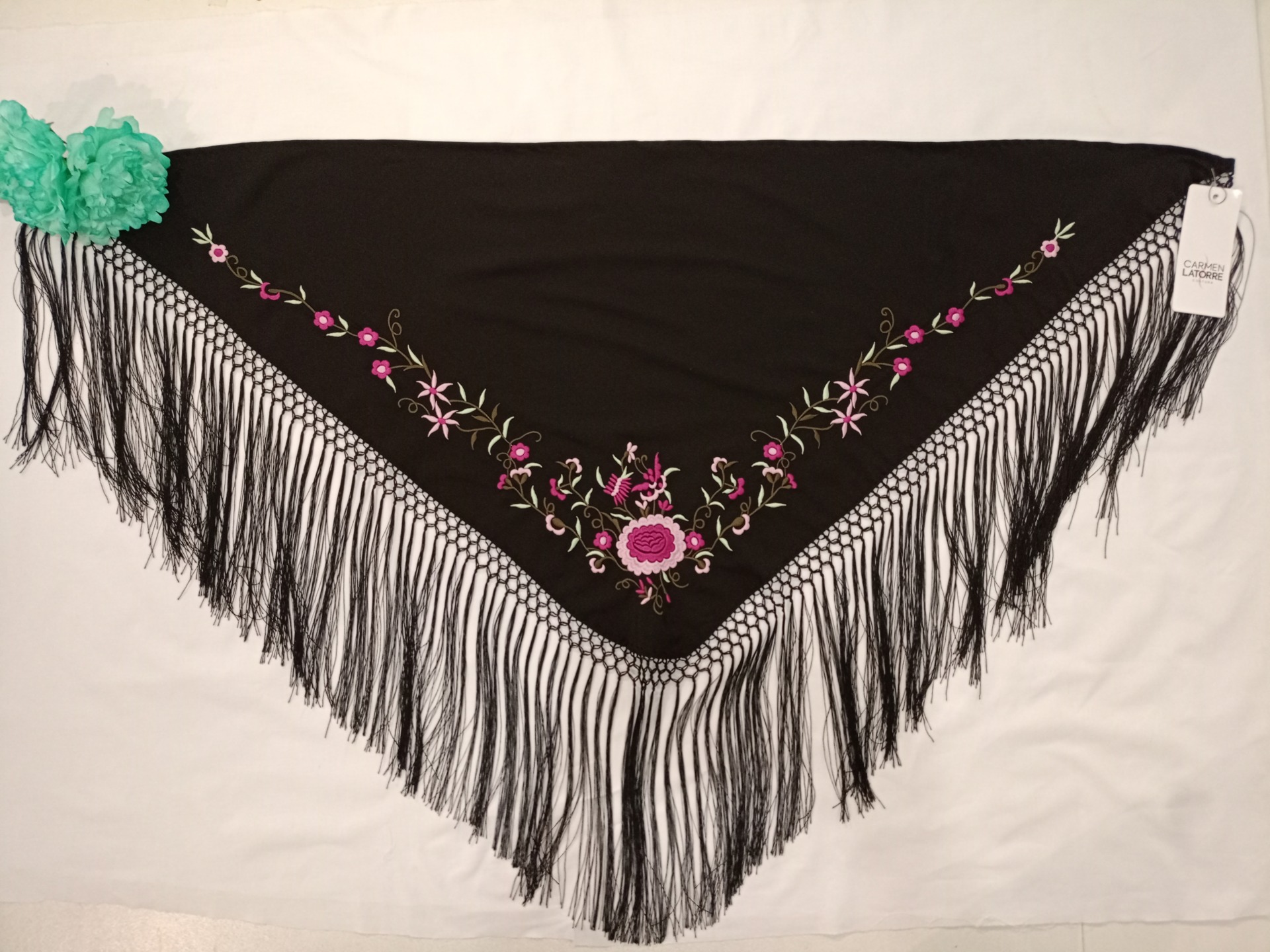 Mantoncillo de señora negro, modelo mariposa con bordados en tonos rosas y verdes.