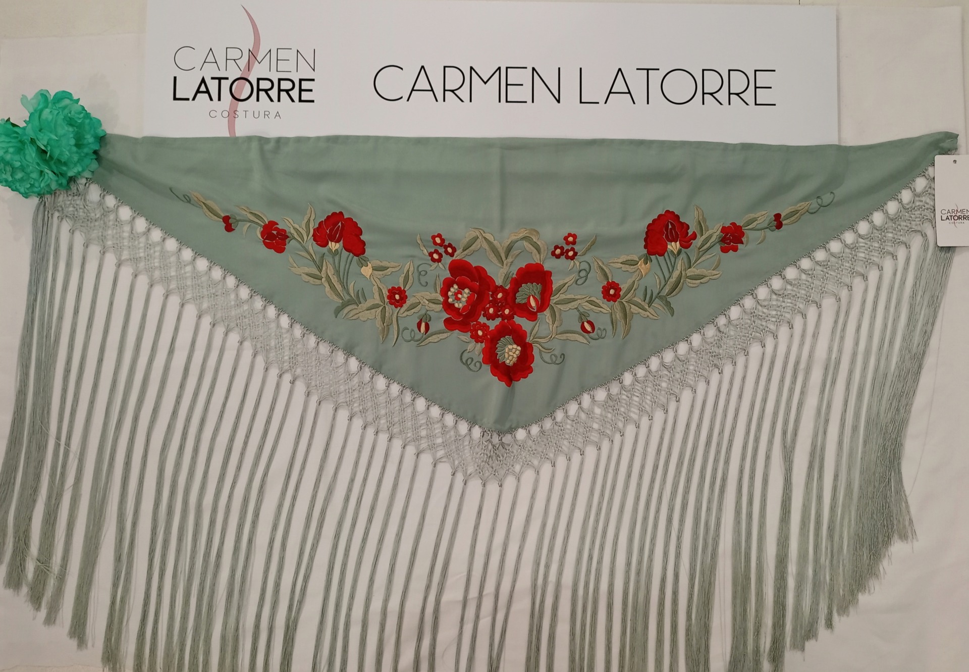 Mantoncillo de señora verde seco, modelo Azo con bordados en tonos rojos y verdes.