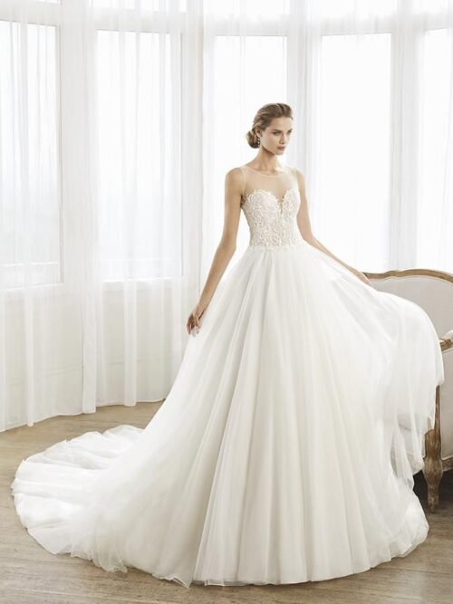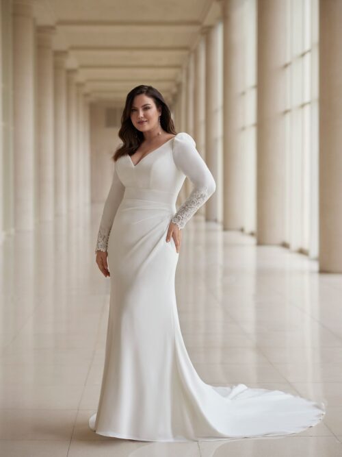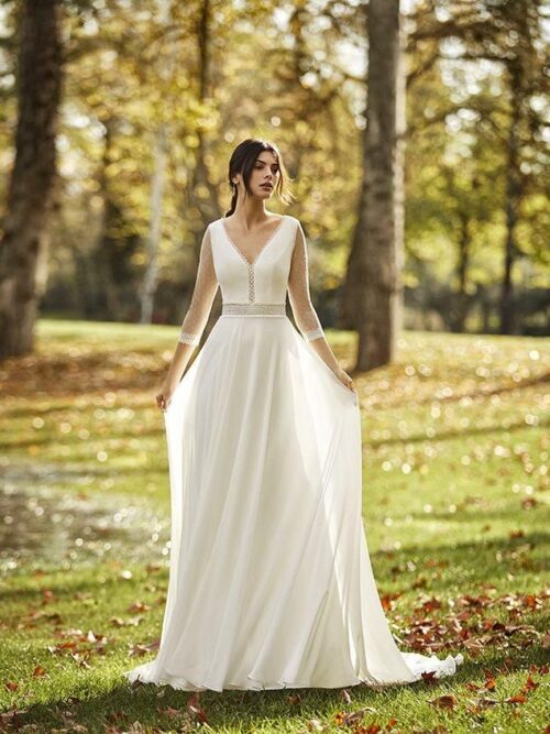 El modelo Mael de Martha Blanc combina estilo juvenil y sofisticación en un corte recto de crepé con drapeado en la cadera. Su escote en V y espalda con encaje aportan romanticismo y delicadeza, mientras que las mangas tipo jamón con aplicaciones de encaje añaden un toque distintivo. La cola media abotonada completa un diseño elegante y actual, ideal para una novia con personalidad.