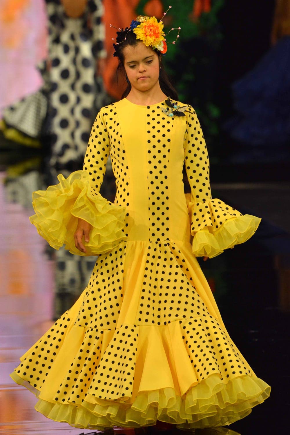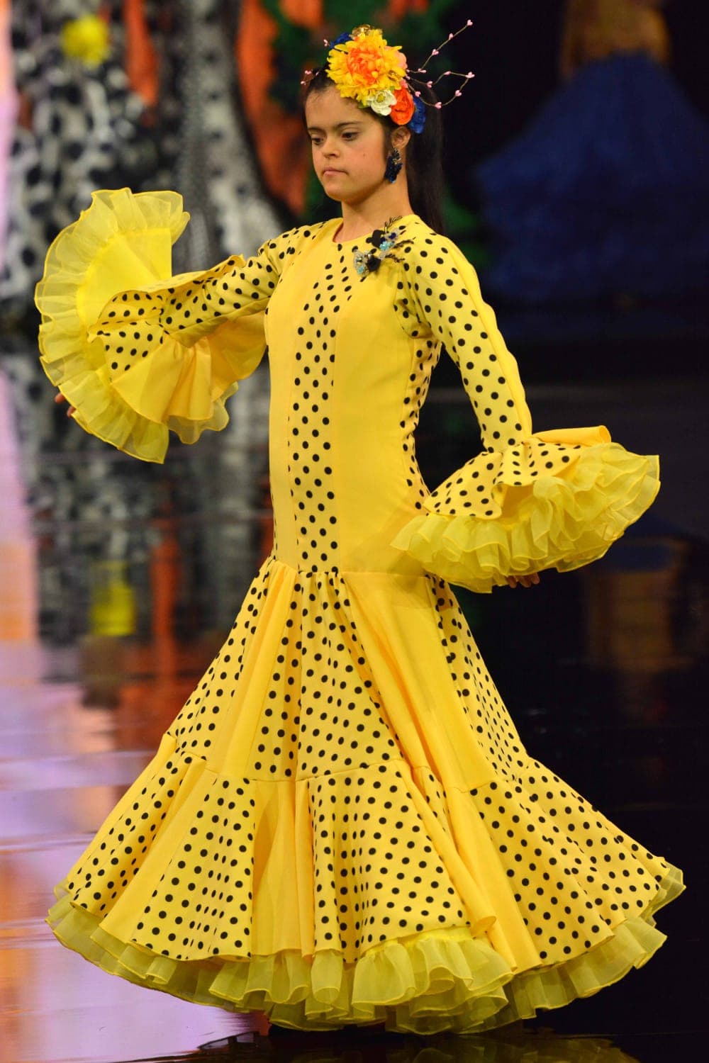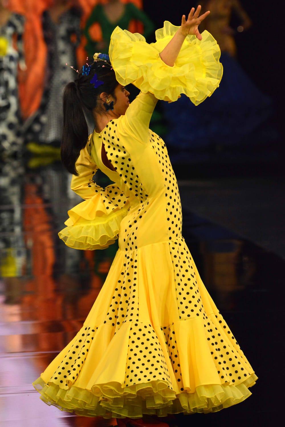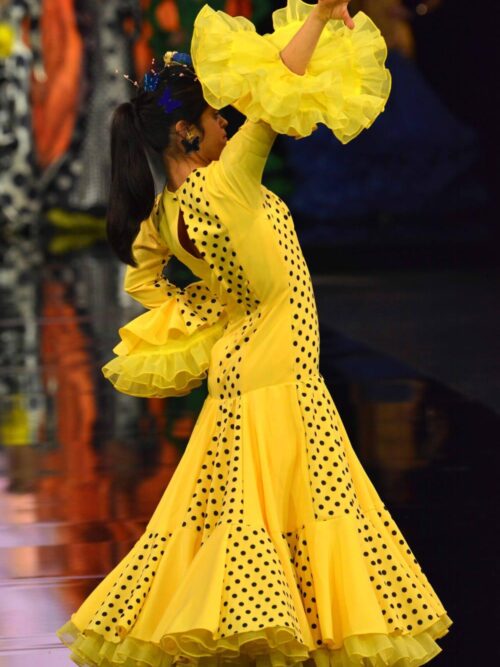 Vestido de flamenca amarillo con lunares combinados mediante nesgas abiertas.