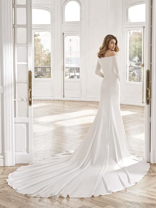 Escote: Tipo bañera, con hombros al descubierto. Como adorno, solo una puntilla de guipur al borde.