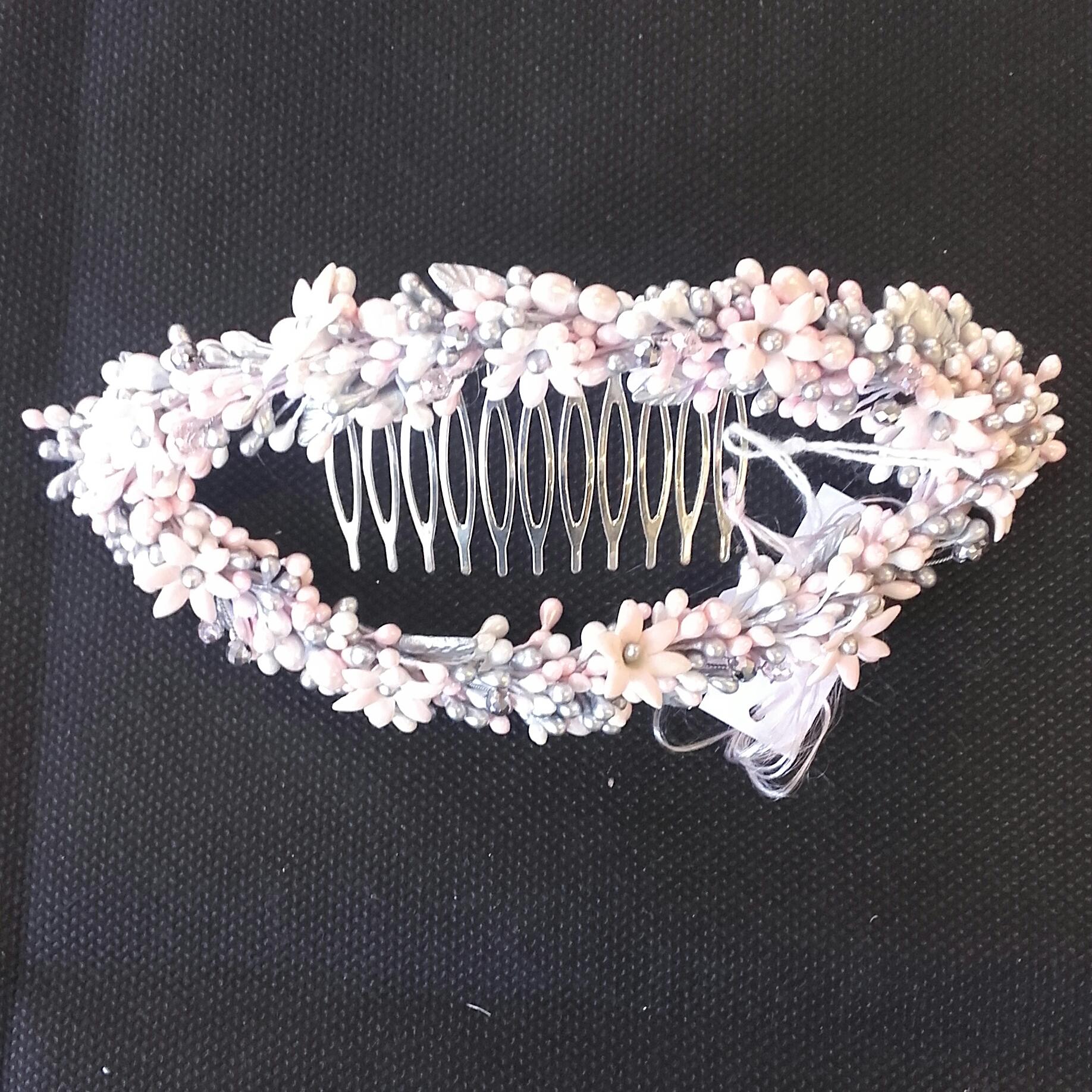 Peinecillo de novia en forma de corona para el pelo elaborado con flores de piedra en tonos rosados y malva con semillas de flores engarzadas.