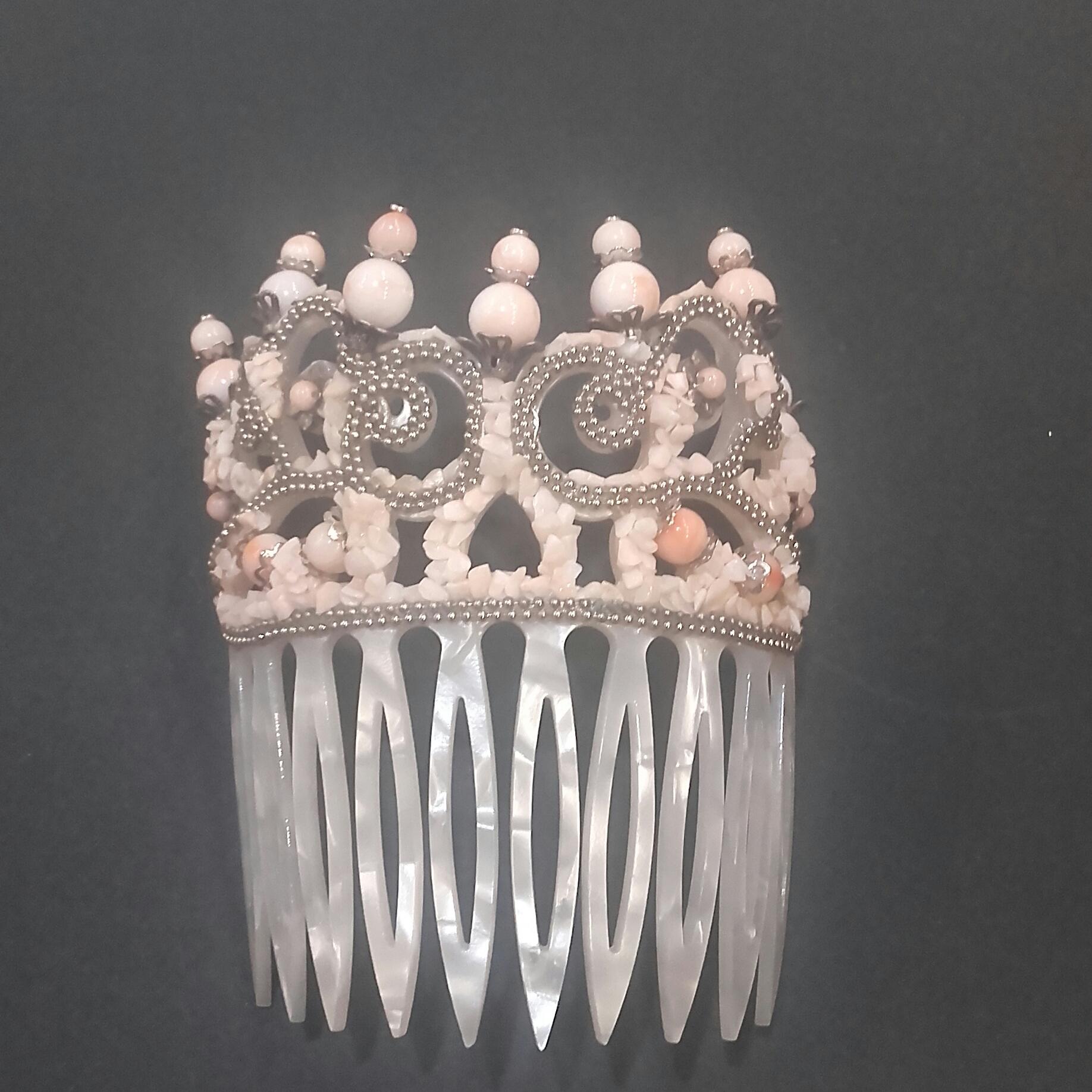 Peineta de nácar blanco adornada con detalles en dorado y coral.