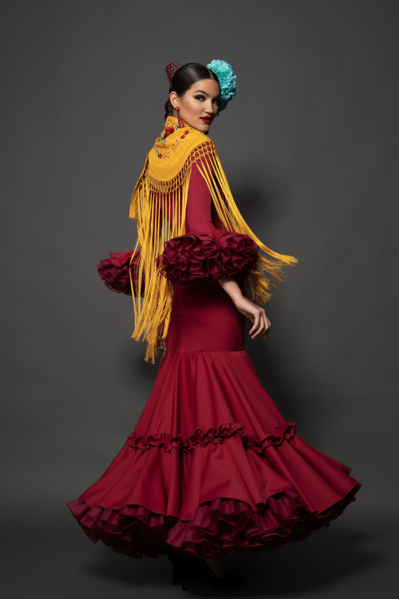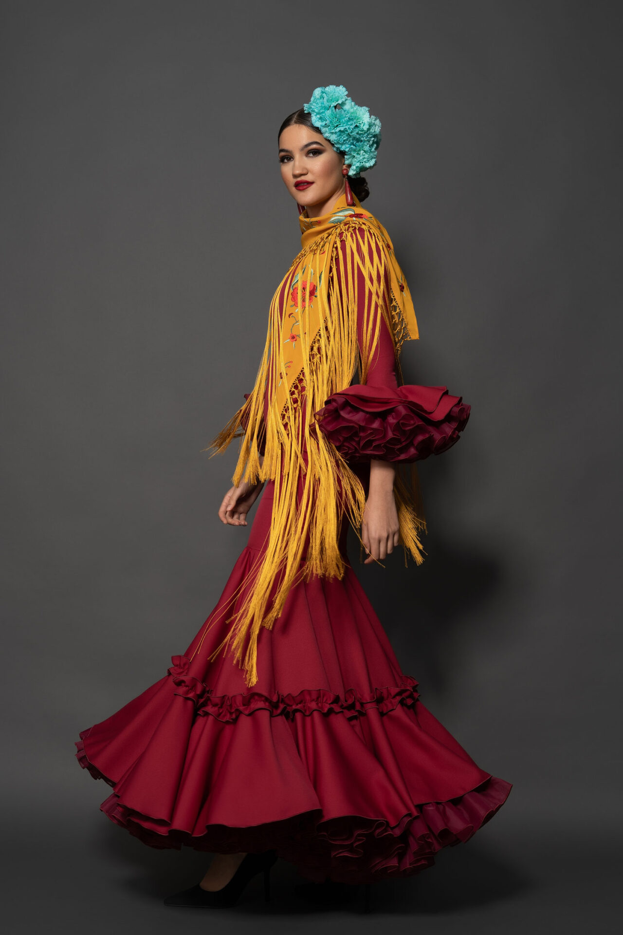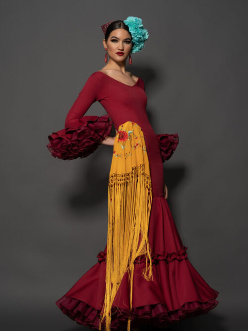 Vestido de biolastan rojo sangre, con falda de capa y carrucha en el volante, enagua de clavel y mangas estrechas con volantes de clavel