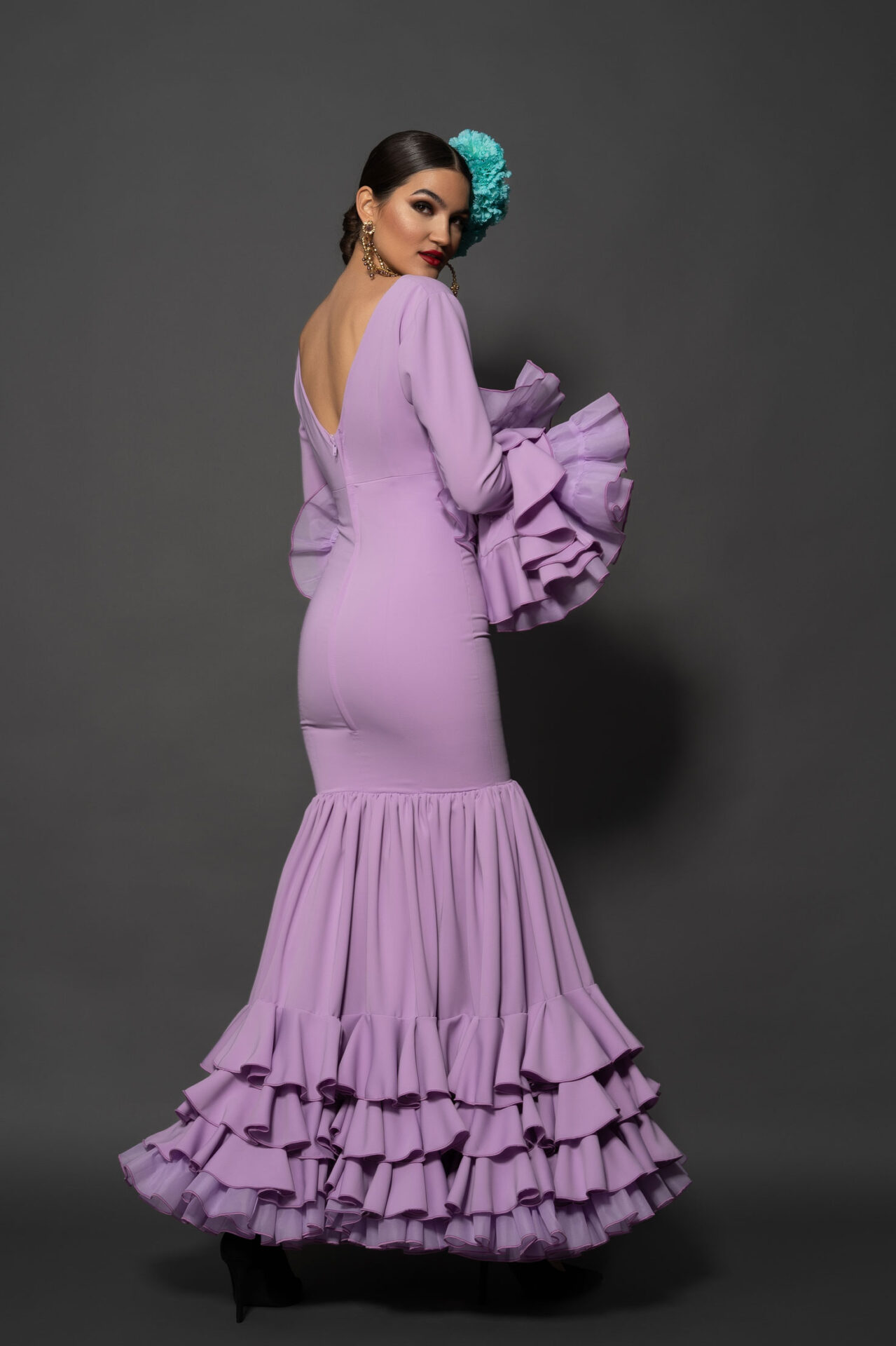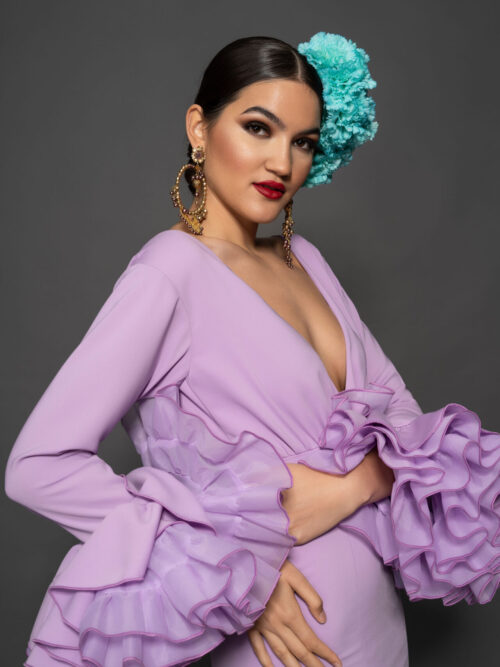 Vestido de elástico malva con corte debajo del pecho y escote de pico, falda con vuelo extra con tres volantes pequeños y enagua de clavel, magas con vuelo.