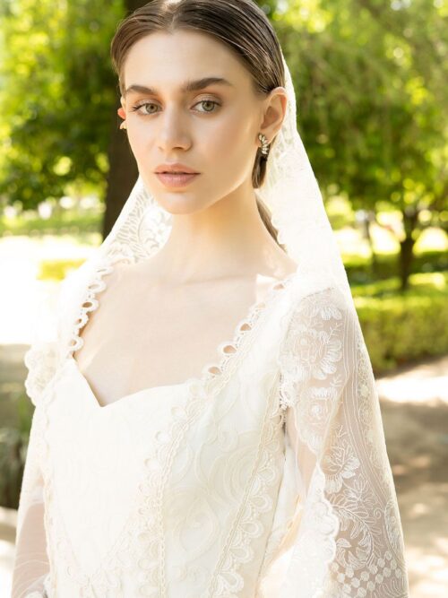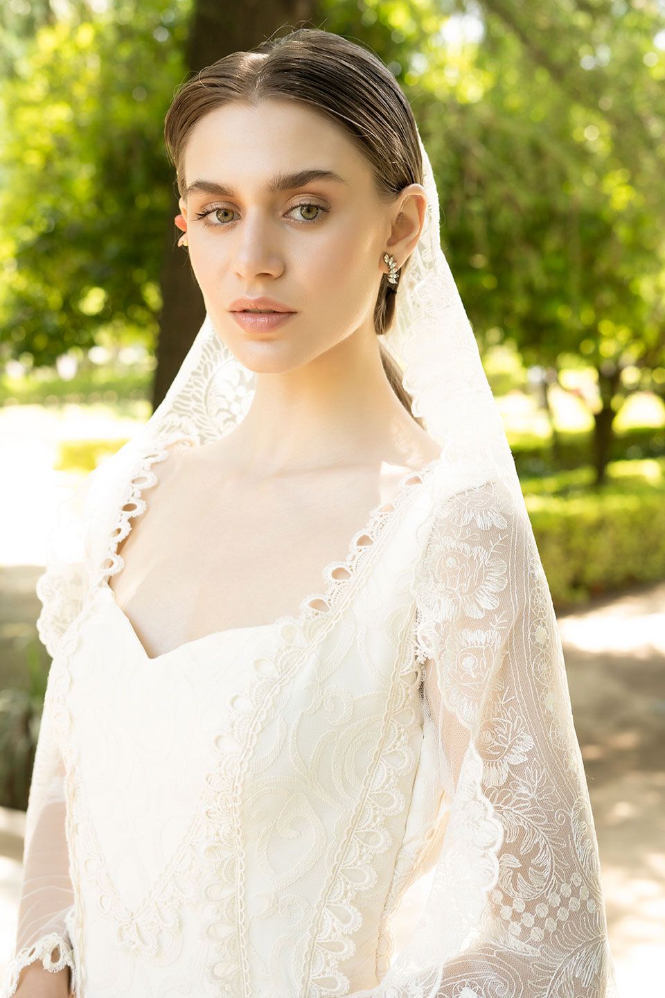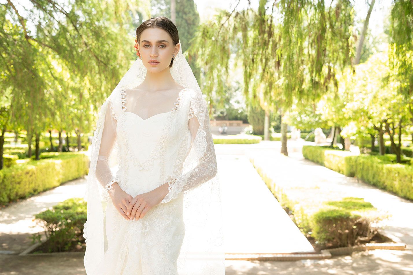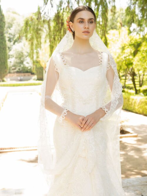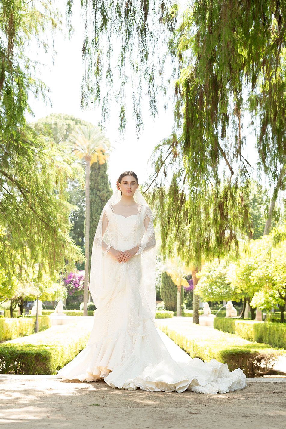 Vestido de encaje combinado con blonda de guipur en cuerpo, escote y espalda. Con línea sirena y un volante en forma de clavel y dos volantes en la cola, revestido de organdil y con mangas de tul transparentes opcionales. Perfecto para esas novias que el flamenco es como su segunda piel.