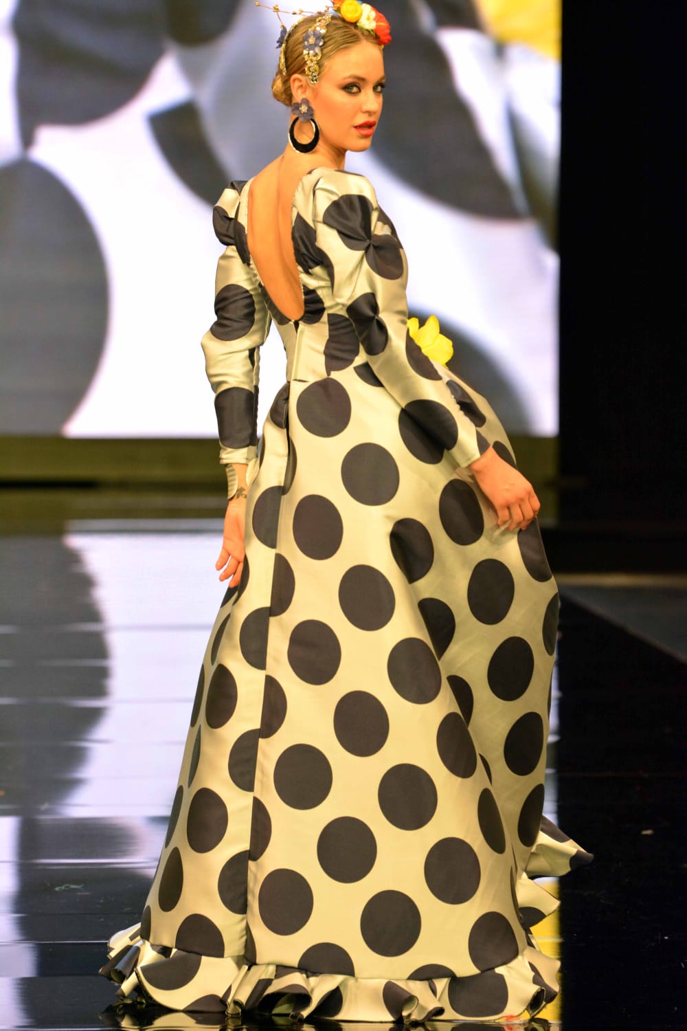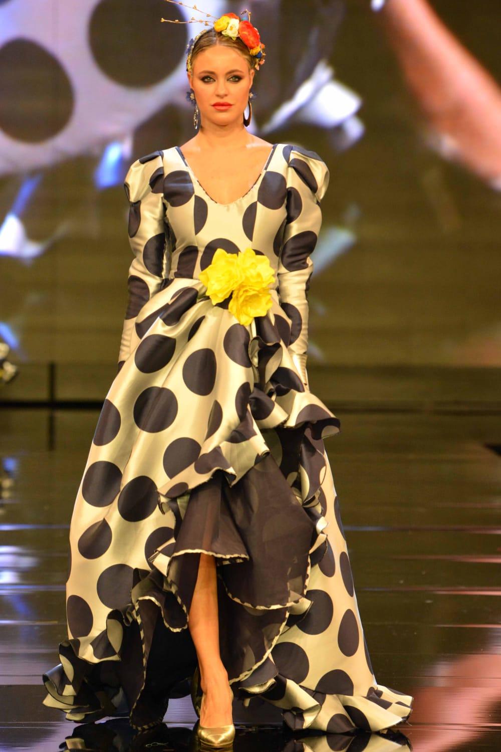 Vestido de flamenca corto y abierto en la parte delantera desde la cadera hacia el bajo en forma de A y largo con volante alrededor. Confeccionado con tela de vistosos y grandes lunares y mangas abullonadas en los hombros. La voluptuosidad de la falda, los dobleces y el doble volante dan mayor cuerpo al vestido bajo un estilo elegante y sofisticado.