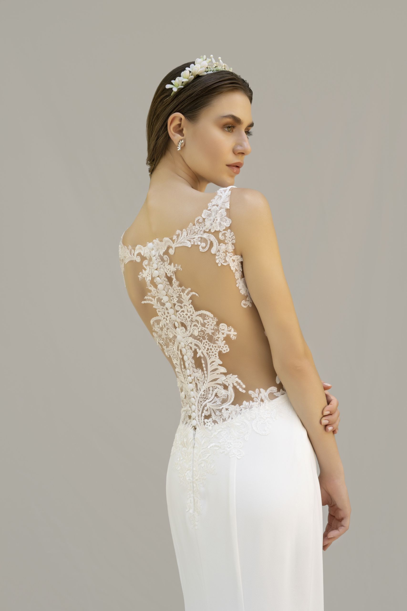 Vestido en crec de satén de licra, de línea sirena, con escote de pico muy favorecedor y puntilla de guipur bordeando el escote de delante, detrás la técnica tantoo donde un tul transparente hasta la cintura elabora un bordado en con motivos de hojas y botonadura hasta la cadera. Posibilidad de ponerle mangas y con una maxi-cola de 2,5 mts. Con posibilidad de acortarla.