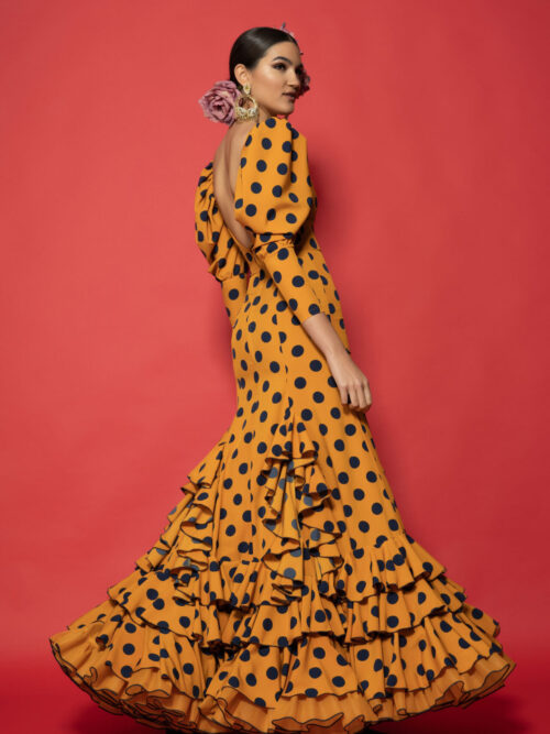 Vestido de crec de seda mostaza con lunares azul marino, enterizo con volantes con subidas y otro redondeando los bajos, manga abullonada y enagua de clavel
