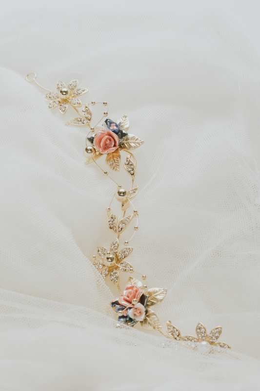 Tocado flexible con ceramica de color rosa y base dorada y zirconitas
