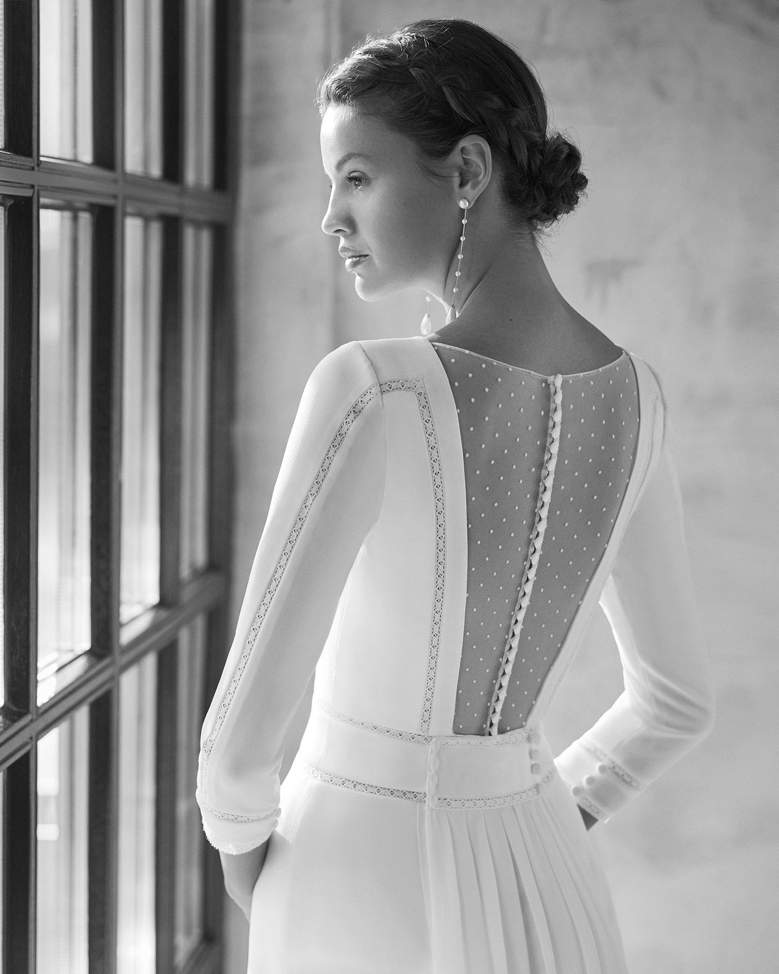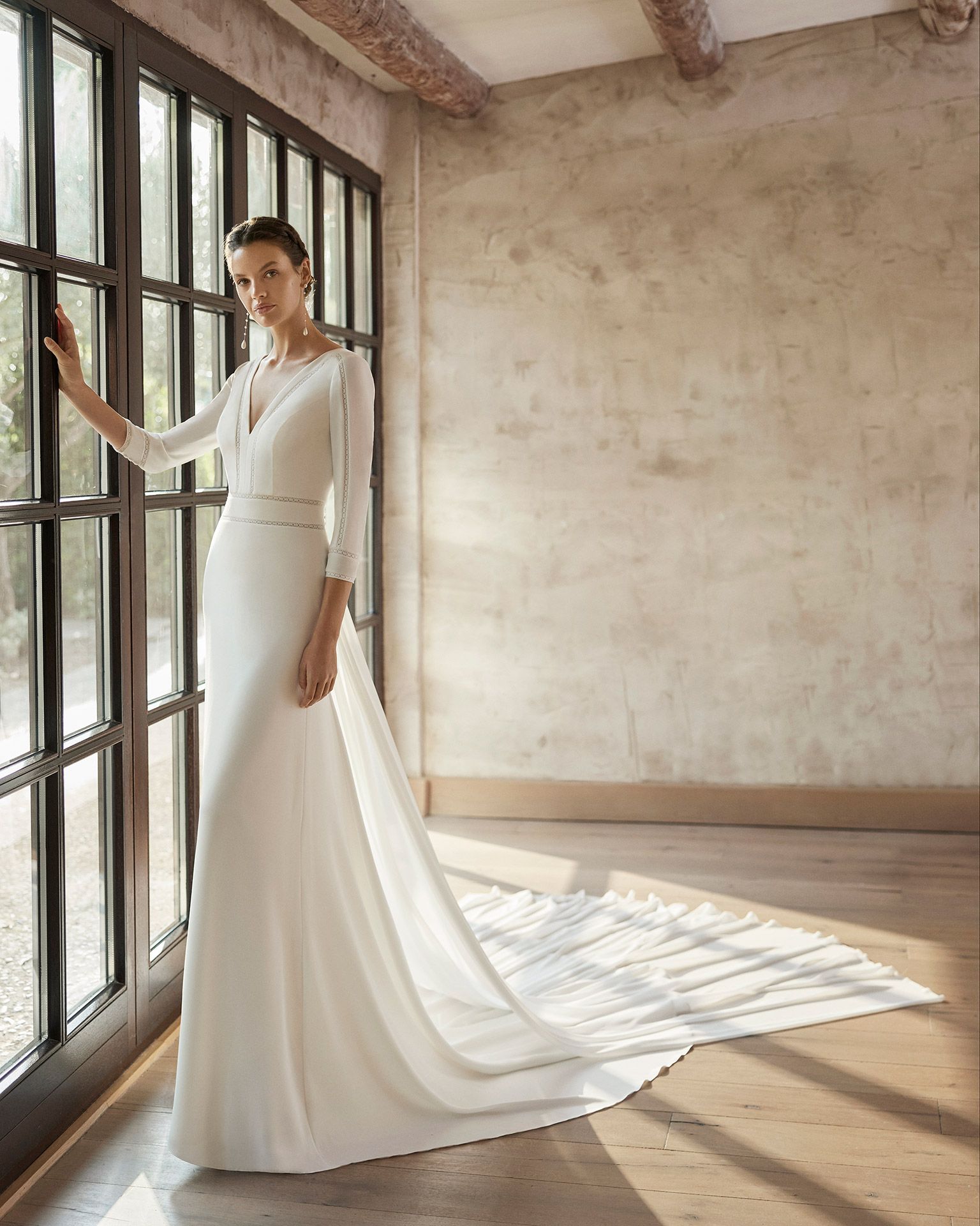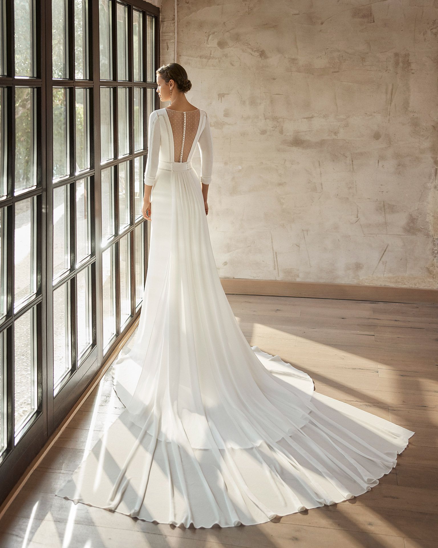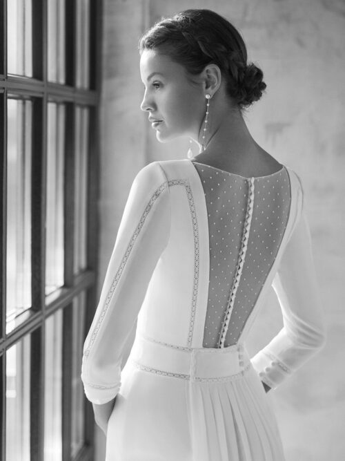 Vestido de novia de estilo Boho chic y artesanal de corte recto, entredos de encaje valencié en delantero, mangas y cintura, escote en V y espalda a la cintura forrada con tul flocado hasta arriba y botones forrados, cola desmontable en georgette y mangas francesas con puños de entredos de encaje. Modelo Aire Barcelona confeccionado en crepé.