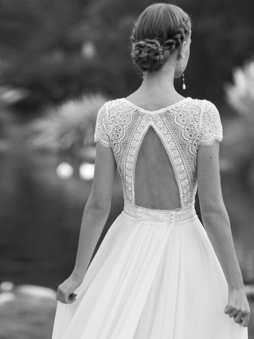 Vestido de novia de estilo Boho chic, con línea de capa en movimiento, cola desmontable, cuerpo de entredos de guipur entrecruzados, escote en V y espada cerrada con triangulo invertido escotado, manga corta con guipur. Modelo Alma Novias confeccionado en georgette.