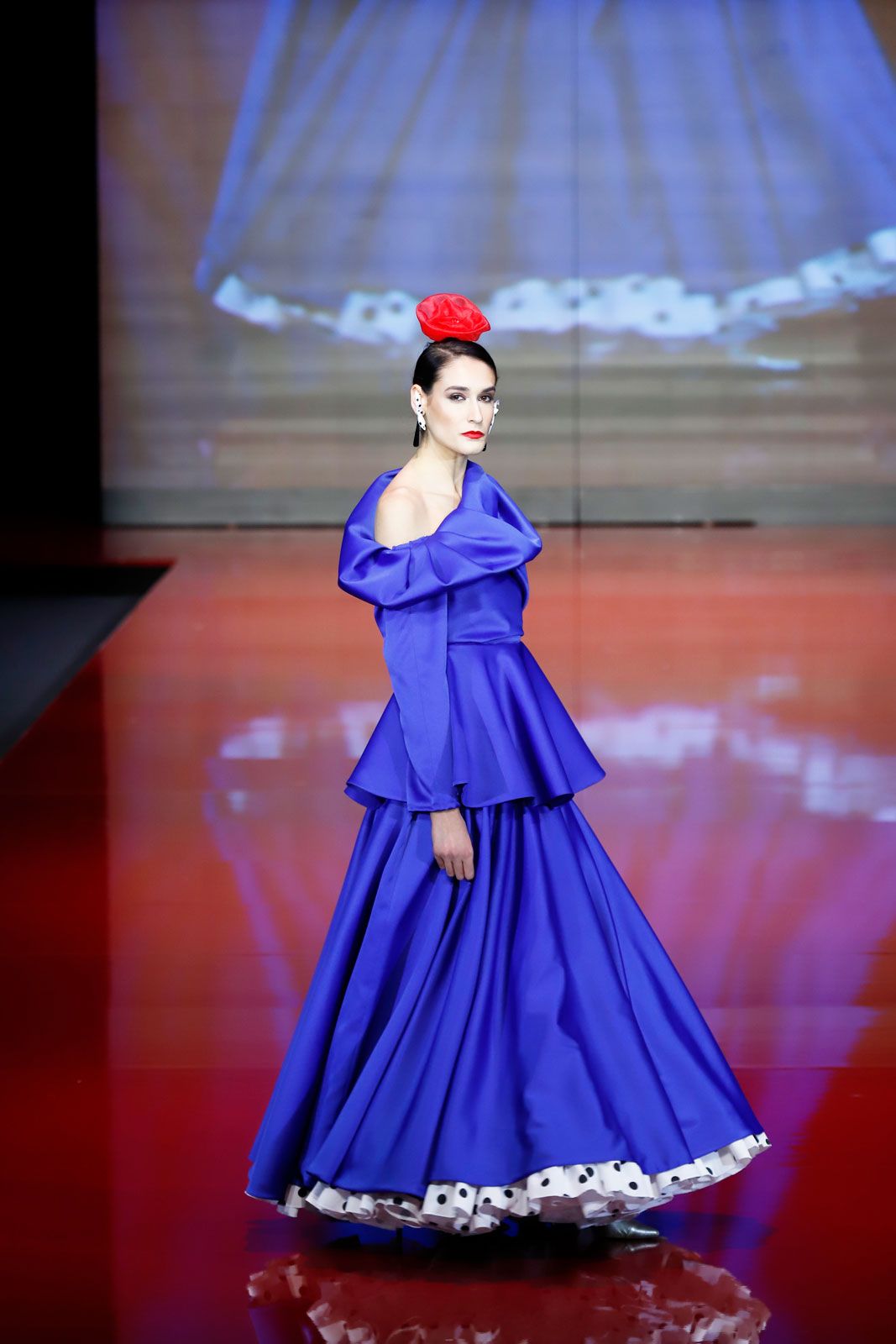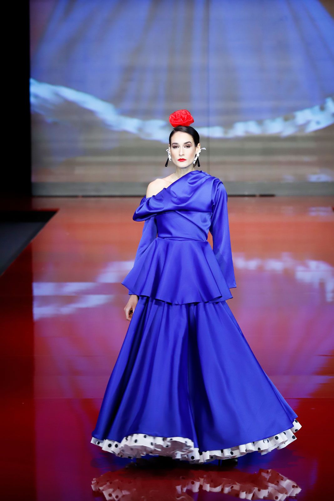 Satén de licra azul noche con volumen en pecho y falda de capa con enagua blanca de lunares negros