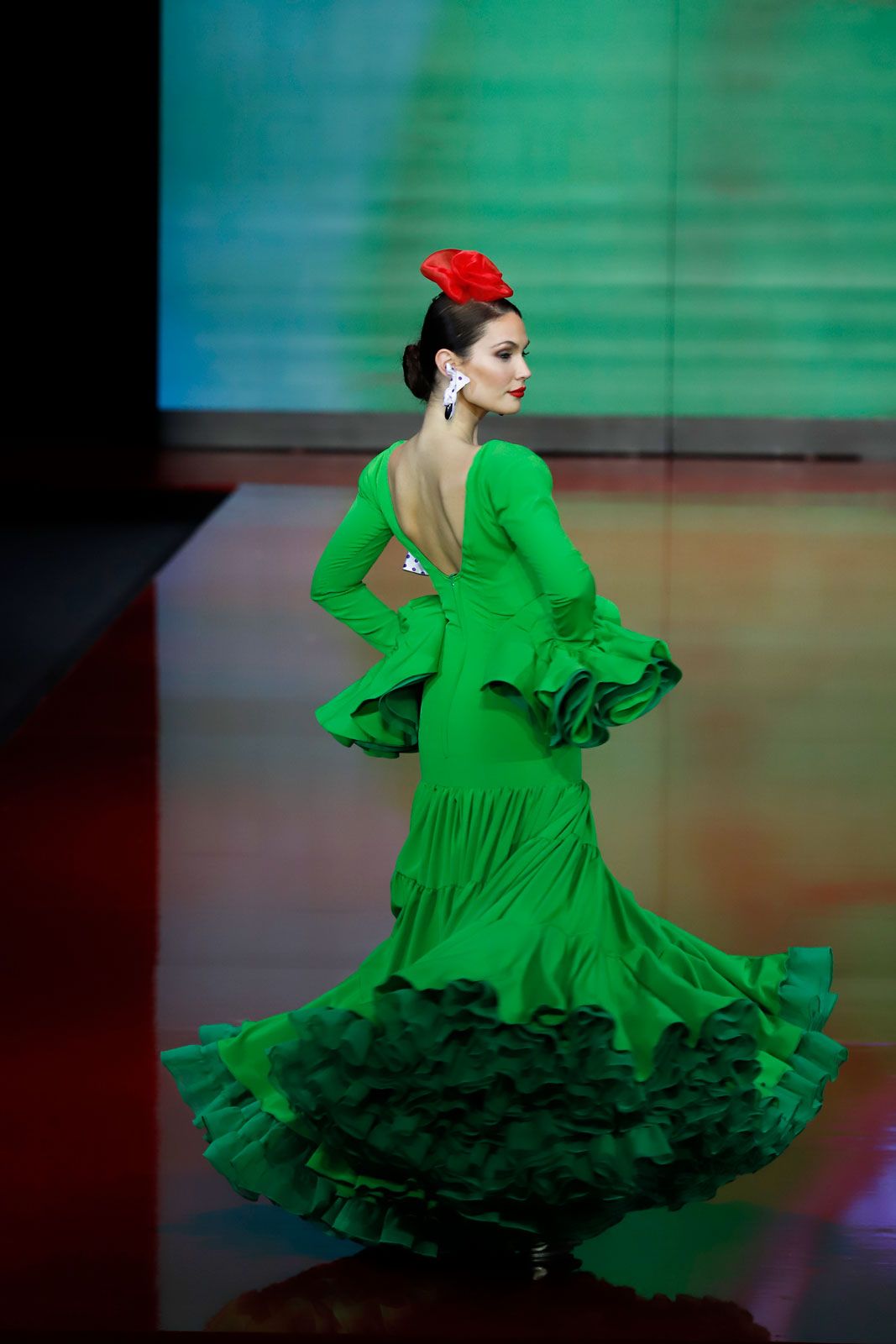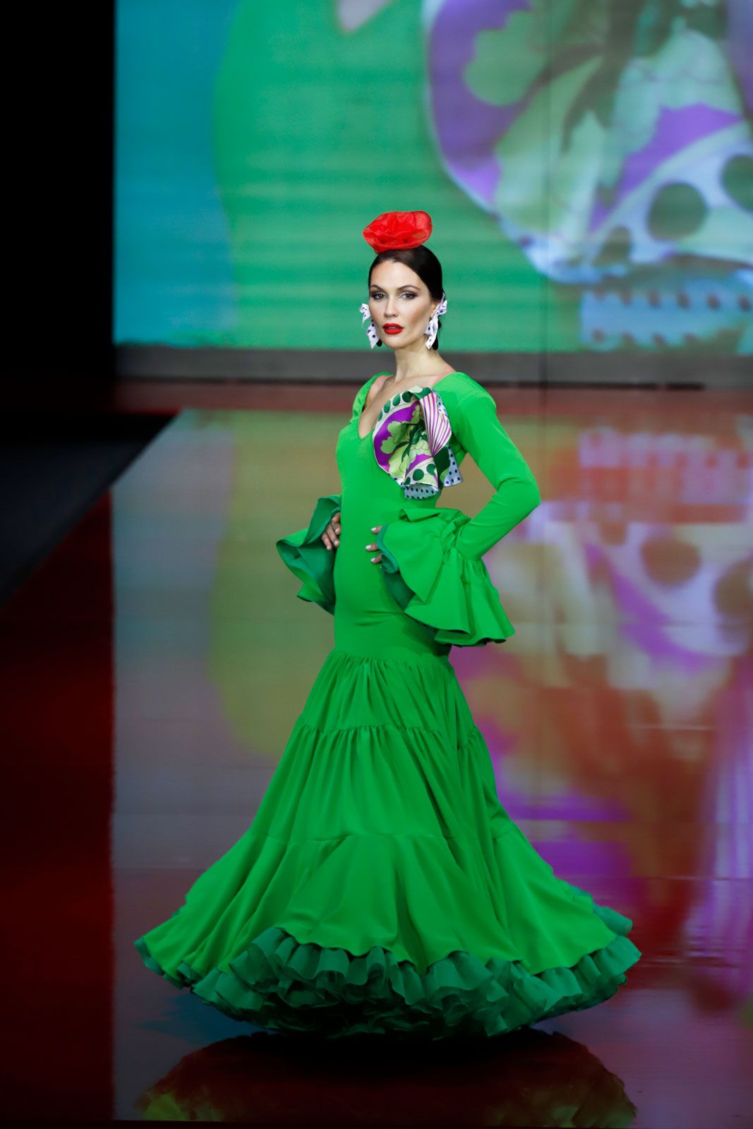 Vestido de crec verde Andalucía con doble vuelo y mangas largas terminadas en volante de capa canastero al igual que la falda enagua al tono. Aplique de flor en estampado malva.