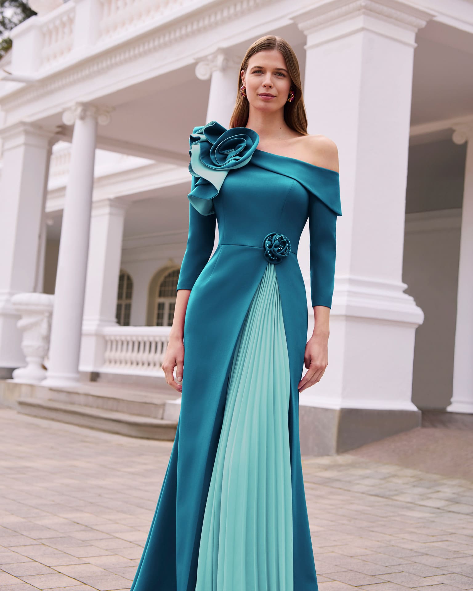 Vestido de fiesta largo de Couture Club, confeccionado en crepé combinado con georgette, que aporta fluidez y elegancia al conjunto. Su escote asimétrico crea una silueta moderna y estilizada, mientras que la manga francesa equilibra el diseño con un acabado sofisticado. Ideal para eventos formales y celebraciones de noche.