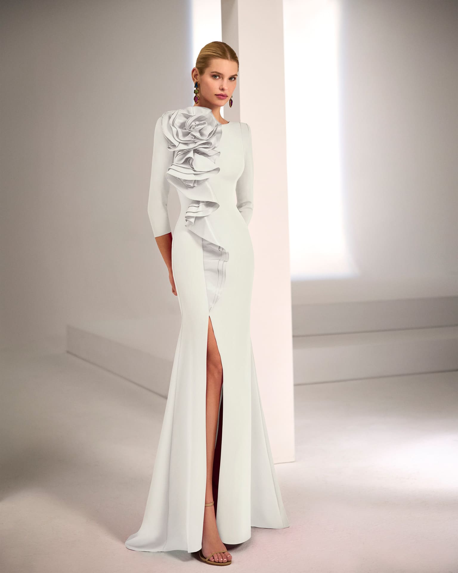 Vestido de fiesta largo de Marfil, confeccionado en crepé elástico, cómodo y favorecedor. Su escote barco realza los hombros, combinado con manga francesa y volantes en el cuerpo que aportan movimiento y elegancia.