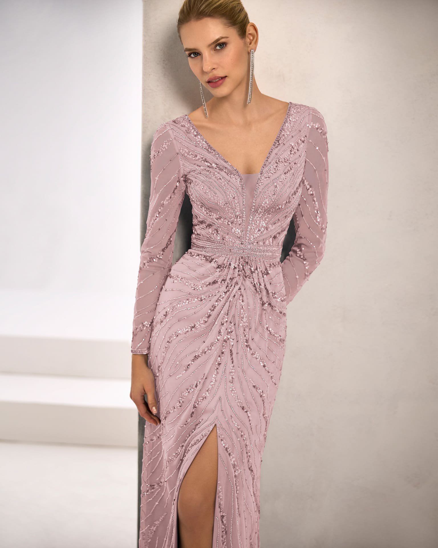 Vestido de fiesta largo de Marfil, confeccionado en pedrería, con escote profundo y espalda en V. Las mangas largas equilibran el brillo del tejido, creando una silueta sofisticada y favorecedora.