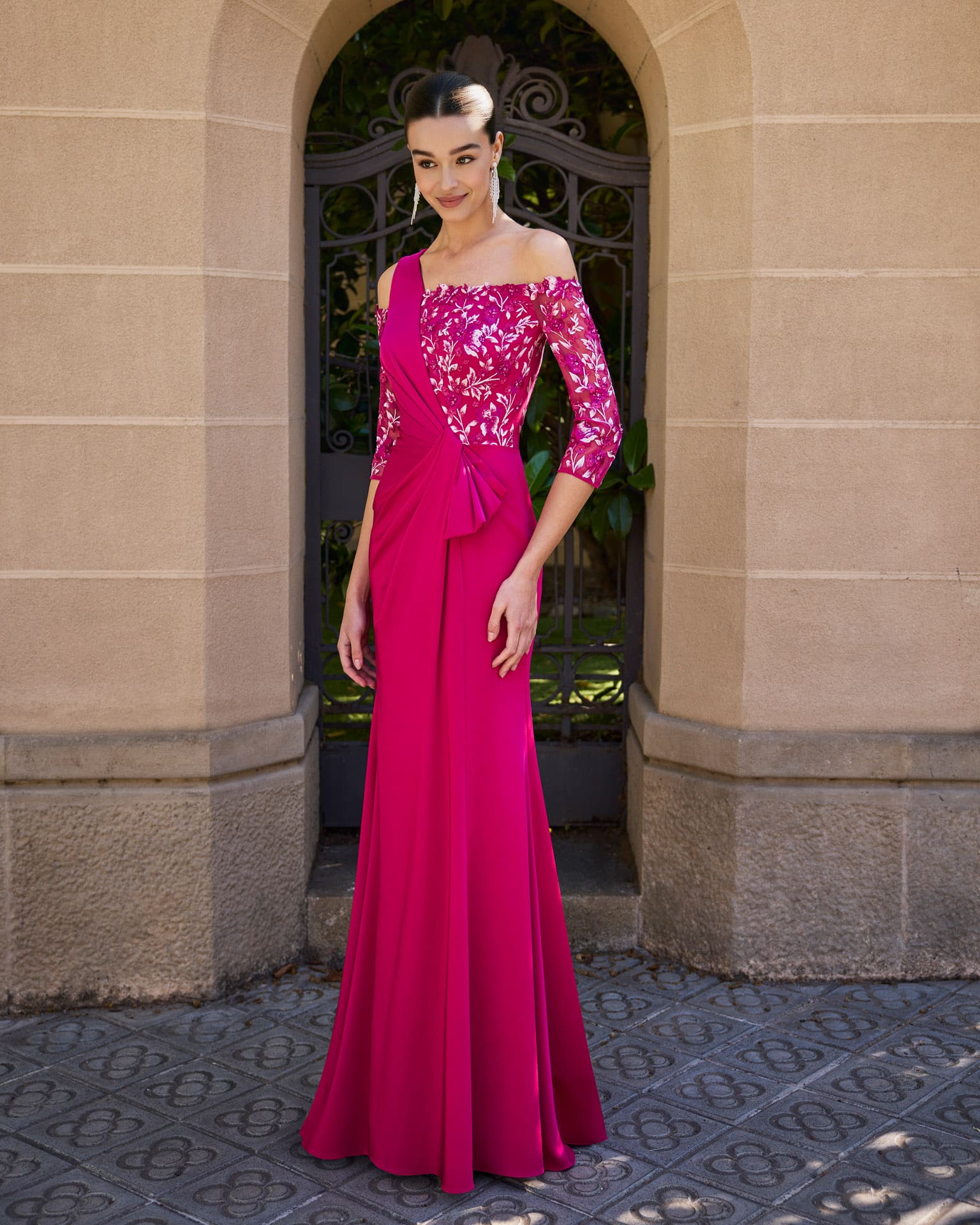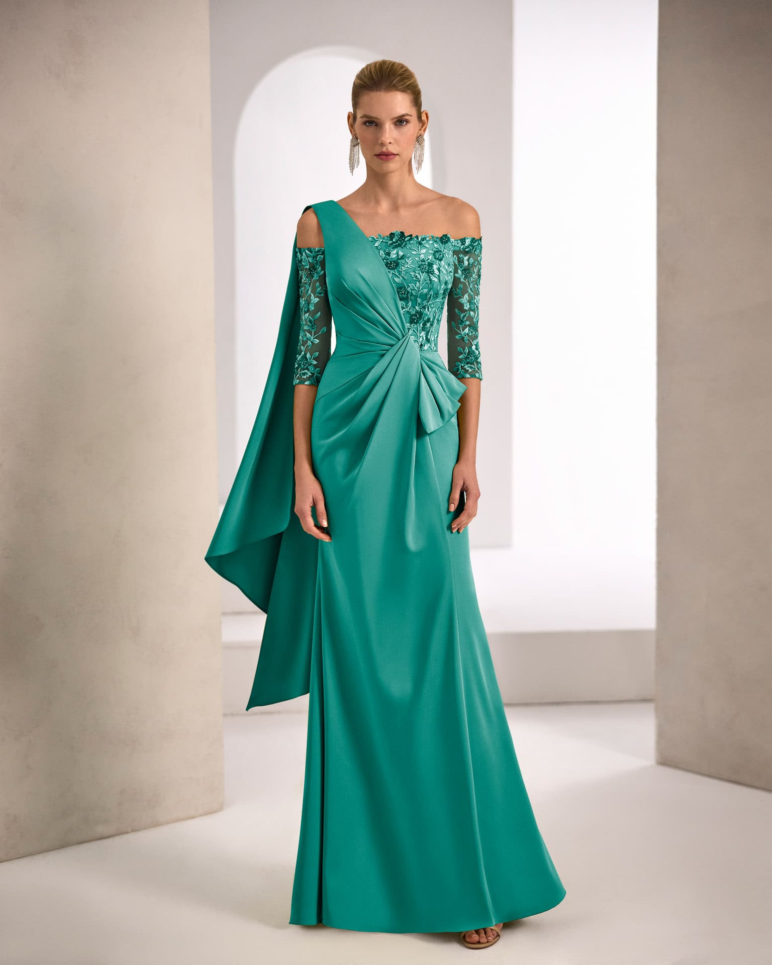 Vestido de fiesta largo de Marfil, confeccionado en crepé satinado, con un elegante escote asimétrico. El encaje en el cuerpo aporta riqueza visual y textura, mientras que la manga francesa completa un diseño sofisticado y femenino.